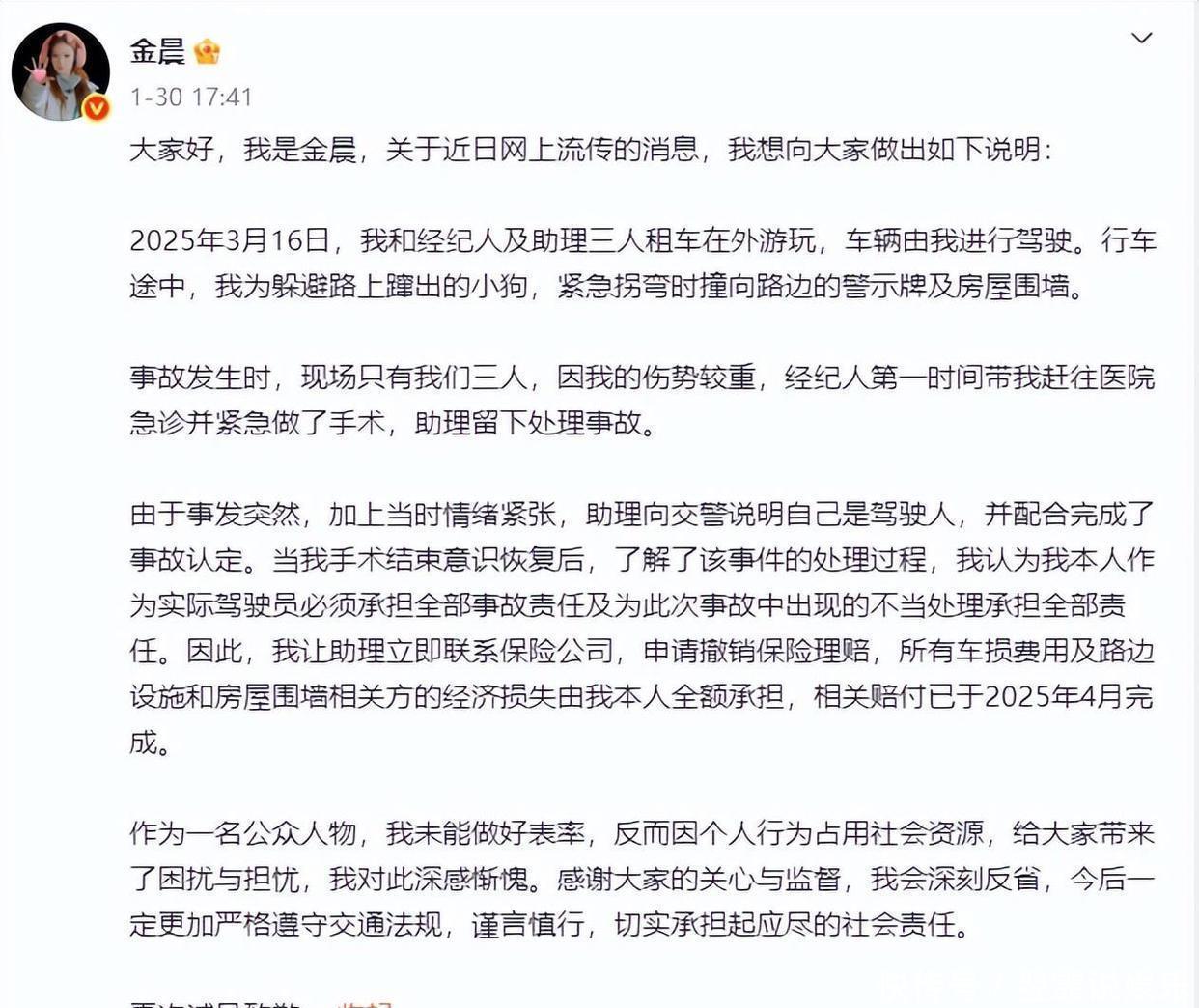 受到网络上巨大压力的影响,金晨只得赶紧站出来回应一番。她“惭愧”地说,自己逃跑完全是被逼无奈,事发那会儿,金晨被撞得血肉模糊,她自己也在评论区晒出过当时那惨不忍睹的场景。为了不耽误治疗,事发后经纪人第一时间就带着金晨去看病了,而助理则留下来打理后续的事情。当时情况紧急,金晨他们还没有意识到自己出错了,可等到金晨恢复清醒后,才意识到自己确实犯了错。为了补偿过失,金晨主动扛下了所有的责任,也逐一进行了赔偿。